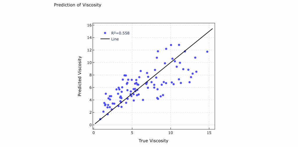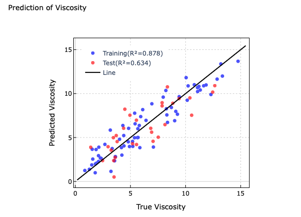 「最小二乗法(OLS)のプレビュー」では,横軸が「True Viscosity」,縦軸「Predicted Viscosity」となっており,横軸に実験値(測定値),縦軸にはOLSモデルによって予測された値が示されています。黒の斜線(Line)は,傾き1の基準線でして,このLineにプロットが近ければ近いほど,予測精度は高い=決定係数(R2)値が1に近い,ということになります。今回の予測では,決定係数(R2)が0.558で予測されています。