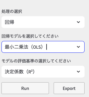 先ほど選択した「標準化」の下に,処理の選択を「回帰」に,「回帰モデルの選択」は「最小二乗法(OLS)」を選択しましょう。回帰モデルを選択すると,「モデルの評価基準の選択してください」という新しいプルダウンメニューが表示され,デフォルトでは「決定係数(R2)」となっています。いくつか評価基準を用意していますが,決定係数(R2)のままで問題ありません。