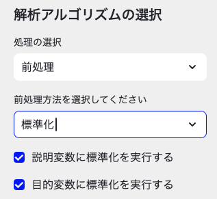 easy-MI上では,解析アルゴリズムの選択タブにて,「処理の選択」→「前処理」を選択した後に,「前処理方法」→「標準化」を選択してください。通常の場合であれば,説明変数(x),目的変数(y)どちらも標準化しておいて問題ありません。ですので,「説明変数に標準化を実行する」「目的変数に標準化を実行する」ともにチェックしたままにしましょう。