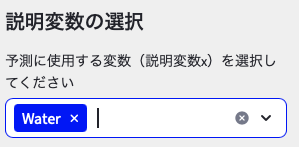 ❸目的変数を選択の時点で,説明変数が自動で選択されていると思いますが,「Water」以外はすべて削除してください(下の図のような状態にしてください)。