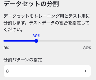 手順は,データセットの分割箇所を「30%」にするのみです。分割パターンは0のままで大丈夫です。