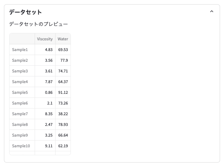 データをアップロードすると,データセットタブにデータセットのプレビューが表示されます。
