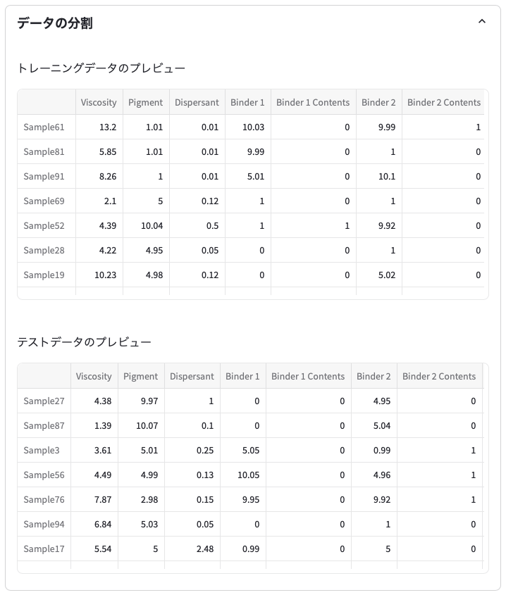 データセットの分割に成功すると,データの分割タブが表示されます。データの分割タブは普段は閉じているので,クリックするとタブが開き,トレーニングデータとテストデータが表示されます。