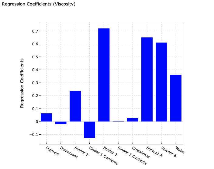 したがって,「Binder 2(バインダー2)」「Solvent A(溶剤A)」「Solvent B(溶剤B)」「Water(脱イオン水)」が粘度(Viscosity)に値を寄与していることが読み取れます。このモデルの決定係数は0.8を超えて十分に高いので,信頼できるモデルと考えられますし,バインダーや溶剤がインクの粘度に効くのは原理原則的にも妥当でしょう。